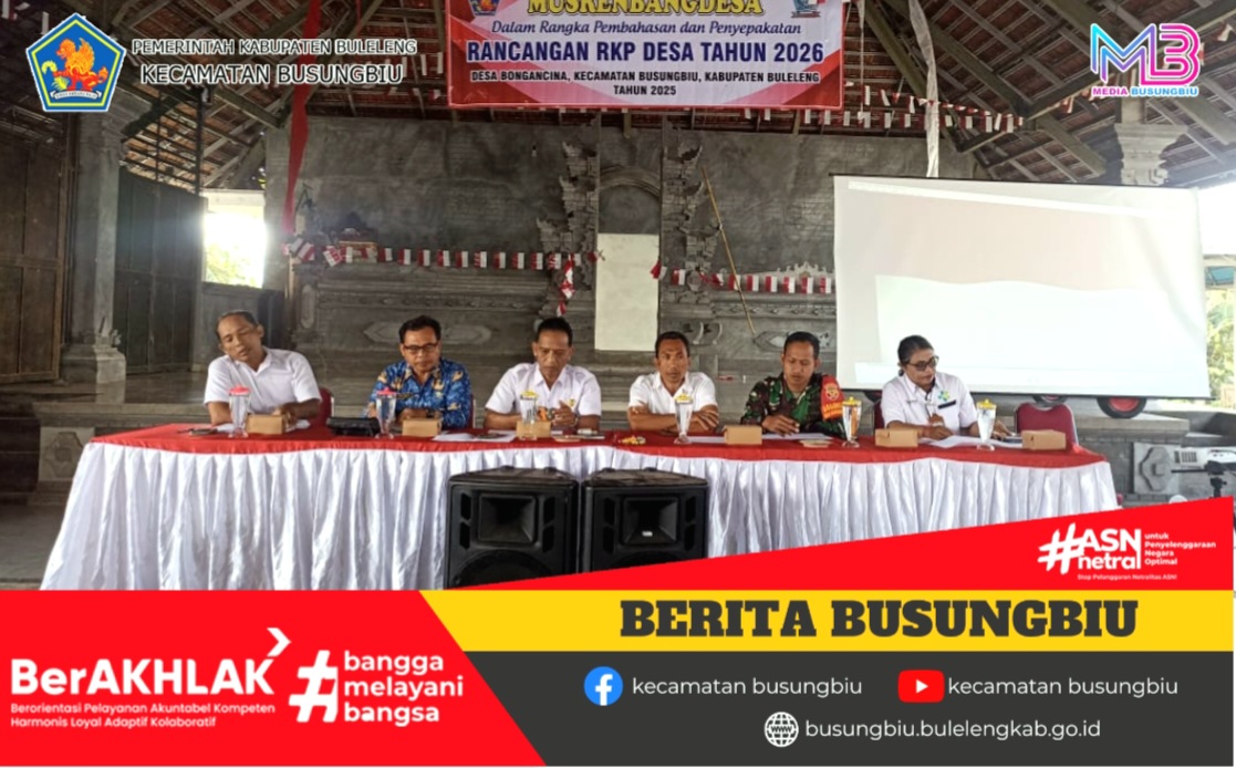 Rabu, 17 September 2025, telah dilaksanakan Musyawarah Perencanaan Pembangunan Desa (Musrenbangdes) RKP Tahun 2026 di Desa Bongancina. Kegiatan ini dihadiri oleh Kasi Pembangunan Kecamatan Busungbiu I Gede Ariasa, S.Sos, bersama Staf Pembangunan I Komang Resa Saputra, S.Ap, Pendamping Desa, Perbekel Desa Bongancina beserta perangkat desa, unsur Desa Adat, anggota BPD, serta seluruh undangan dan perwakilan masyarakat Desa Bongancina.