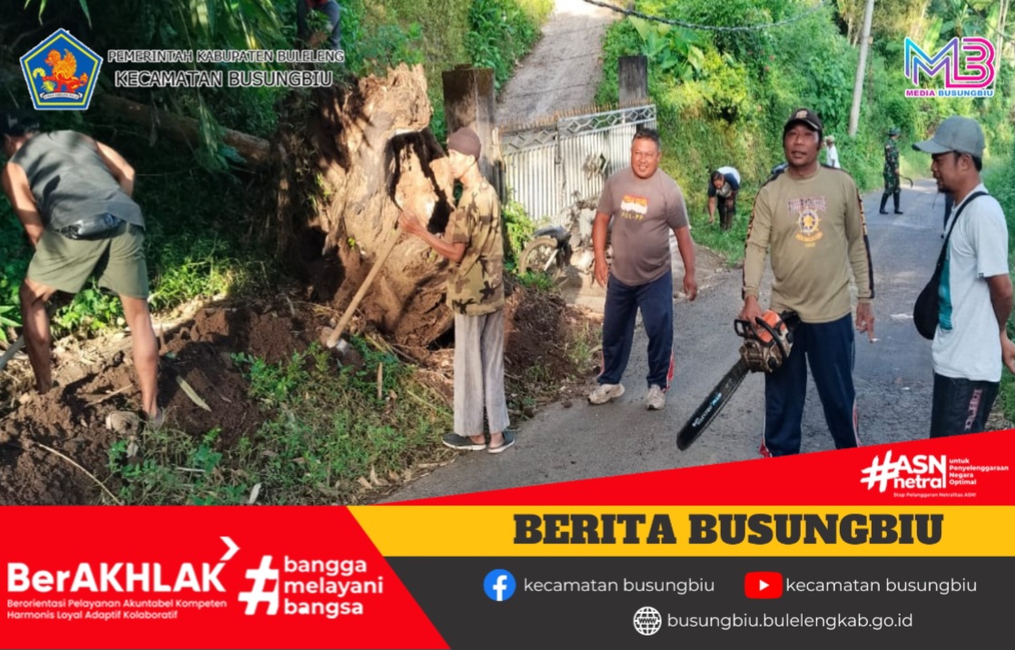 Satuan Polisi Pamong Praja Kecamatan Busungbiu bersama Pemerintah Desa Kedis dan warga setempat melaksanakan kegiatan gotong royong dalam rangka evakuasi pohon tumbang yang terjadi di wilayah Sebetan, Banjar Dinas Kelodan, Desa Kedis.