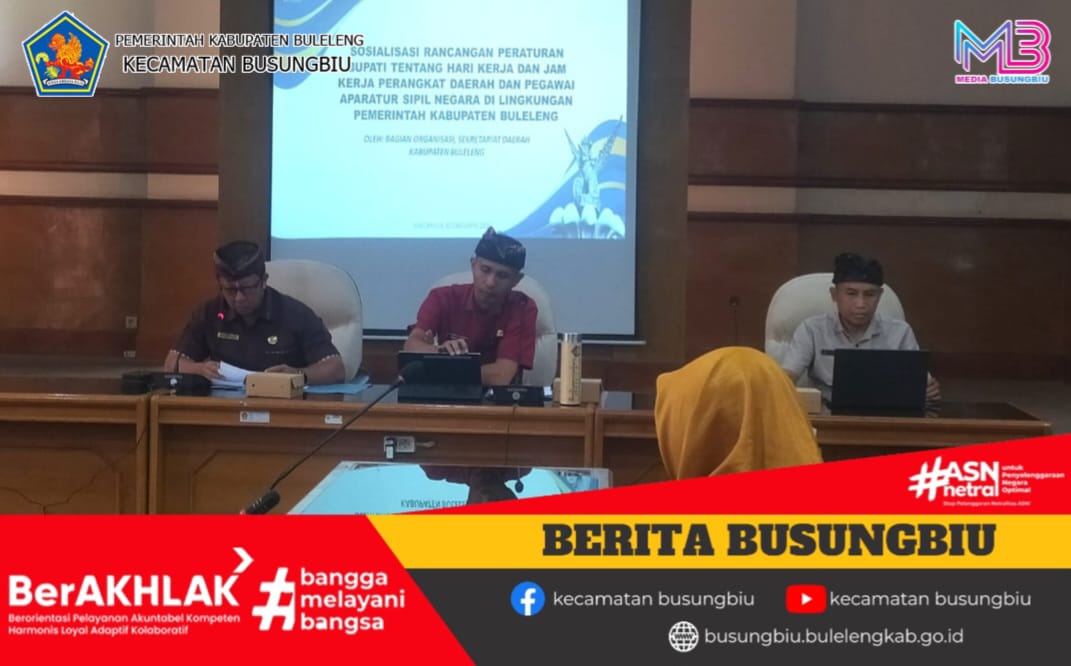Senin, 12 Februari 2026, Sekretaris Camat Busungbiu I Putu Edy Sutrisna, S.Kom menghadiri kegiatan Sosialisasi Peraturan Bupati Buleleng Nomor 59 Tahun 2025 tentang Tata Naskah Dinas serta Rancangan Peraturan Bupati tentang Hari Kerja dan Jam Kerja Perangkat Daerah dan Pegawai ASN di Lingkungan Pemerintah Kabupaten Buleleng. Kegiatan tersebut dilaksanakan di Ruang Rapat Unit IV Sekretariat Daerah Kabupaten Buleleng.Acara dibuka oleh Asisten Administrasi Umum Setda Kabupaten Buleleng, Drs. Gede Sugiartha Widiada, M.Si, dan dihadiri oleh Kepala Bagian Organisasi serta perwakilan Organisasi Perangkat Daerah (OPD) se-Kabupaten Buleleng.Dalam sosialisasi tersebut disampaikan bahwa tujuan pengaturan tata naskah dinas adalah untuk meningkatkan ketertiban, efisiensi, dan efektivitas administrasi dalam penyelenggaraan pemerintahan daerah. Peraturan Bupati ini mengatur secara rinci mengenai pembuatan kop surat (wajib menggunakan tulisan Bali di atas tulisan Latin), sistem penomoran, penggunaan naskah dinas, pencantuman paraf, penandatanganan (baik tanda tangan basah maupun elektronik), serta penggunaan stempel yang mengalami perubahan dari ketentuan sebelumnya. Penerapan tata naskah dinas ini diberlakukan mulai tanggal 2 Februari 2026.