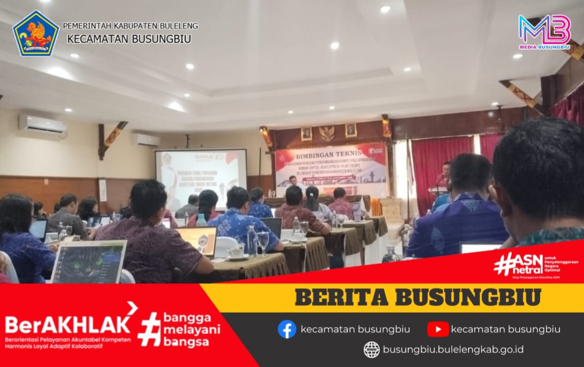 Selasa,10 Pebruari 2026, bertempat di Hotel Aneka Lovina, Kasubag Umum dan Keuangan Kecamatan Busungbiu, Komang Windasari, SE mengikuti kegiatan Bimbingan Teknis Penyusunan Rencana Pengembangan Kompetensi Aparatur/ Human Capital Development Plan (HCDP) di lingkup Pemerintah Kabupaten Buleleng.Kegiatan ini dibuka oleh Kepala BKPSDM Kabupaten Buleleng I Made Dwi Adnyana, S.STP, M.A.P, yang sekaligus memberikan arahan. Disampaikan, bahwa penyusunan HCDP menjadi langkah strategis untuk memastikan pengembangan kompetensi aparatur berjalan terarah, terencana, dan selaras dengan kebutuhan organisasi serta visi pembangunan daerah.