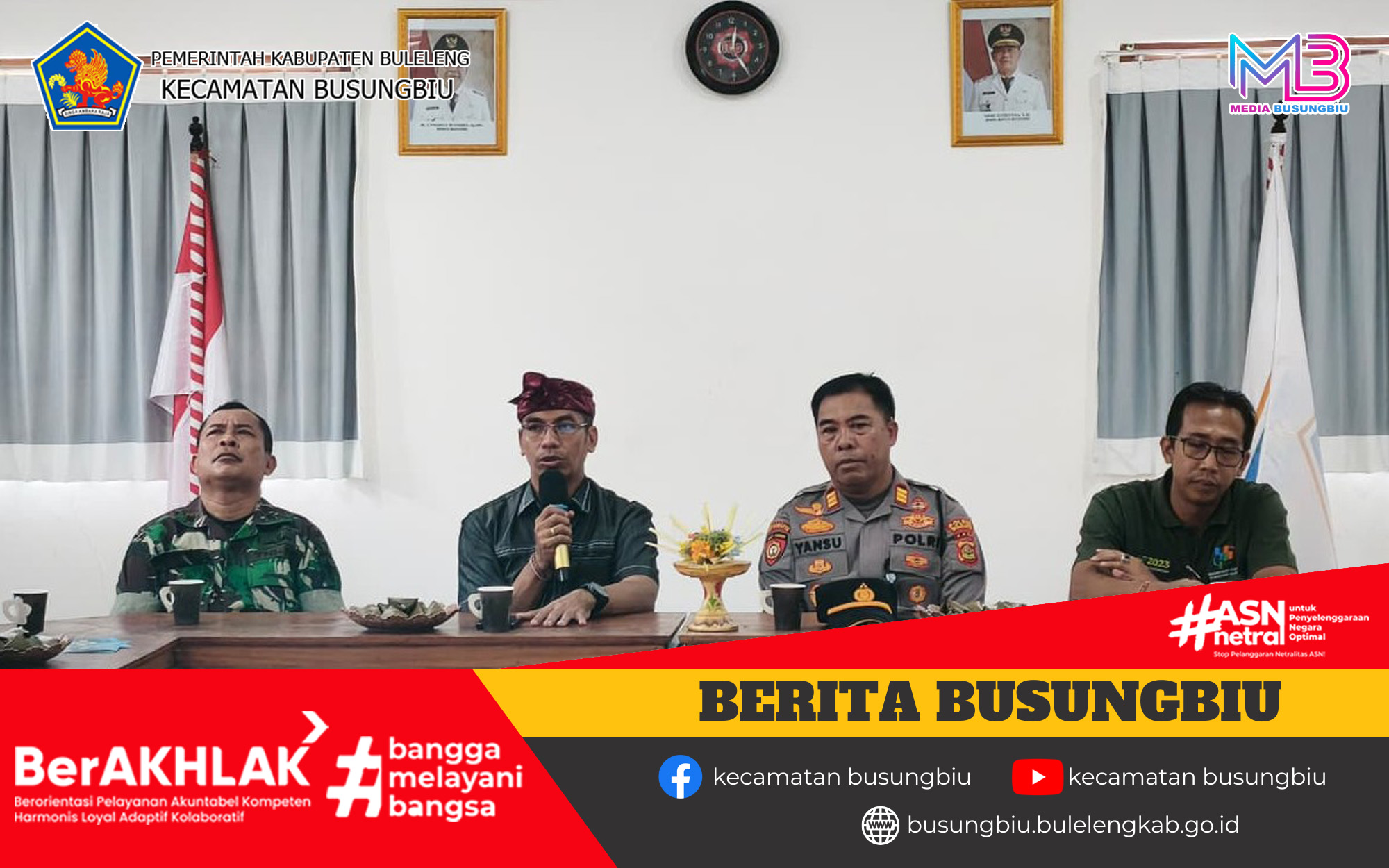 Jumat, 9 Januari 2026, bertempat di Ruang Rapat Kecamatan Busungbiu. Plt. Camat Busungbiu, Nyoman Agus Tri Kartika Yuda, S.IP., M.Si memimpin Rapat Koordinasi Kecamatan yang dihadiri oleh Kapolsek Busungbiu, Danramil Busungbiu dan Perbekel se-Kecamatan Busungbiu. Kegiatan diawali dengan perkenalan dan sambutan dari Plt. Camat Busungbiu, Nyoman Agus Tri Kartika Yuda, S.IP., M.Si. yang menyampaikan permohonan kerjasama dari unsur Forkompincam dan Perbekel selama melaksanakan tugas sebagai pelaksana tugas Camat Busungbiu. Disampaikan juga tentang pelaksanaan Gerakan Kulkul PKK dan Posyandu yang menjadi program dari TP PKK Propinsi Bali yang akan dilaksanakan serentak pada hari Minggu, 11 Januari 2026 dan berkelanjutan setiap hari Minggu pada Minggu Pertama bulan selanjutnya. Ditekankan pula untuk memperkuat koordinasi serta kerjasama penanganan bencana selama musim penghujan yang saat ini sedang berlangsung.