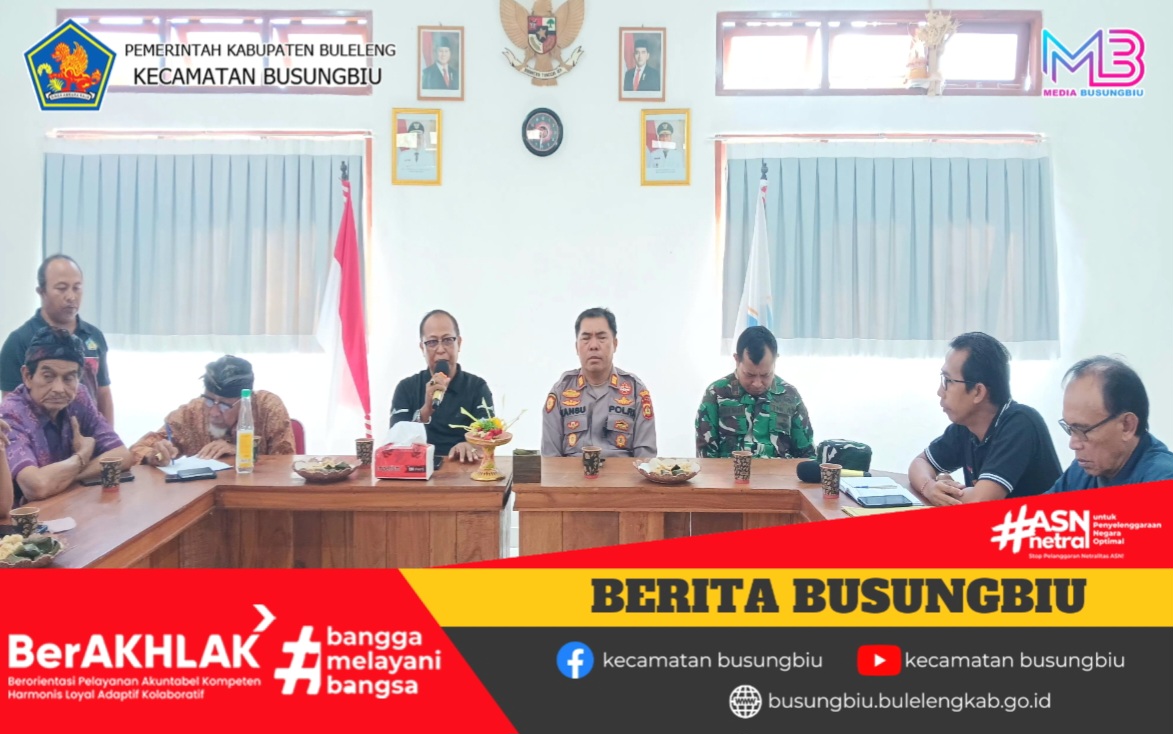 Rapat dipimpin langsung oleh Camat Busungbiu, Putu Gede Yudana, S.H., serta dihadiri oleh Forkopimcam Busungbiu, MDA Kecamatan, Instansi terkait, para Perbekel, dan Bendesa Adat se-Kecamatan Busungbiu.