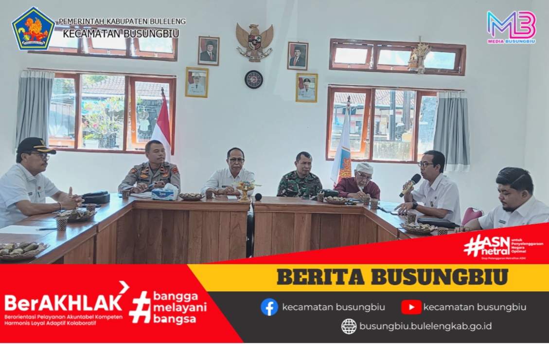 Dalam rapat tersebut dibahas berbagai hal teknis terkait persiapan kegiatan, khususnya penentuan tema, kesiapan partisipasi desa dan sekolah, serta inventarisasi potensi seni yang dapat ditampilkan. Adapun pelaksanaan Festival Kecamatan Busungbiu direncanakan berlangsung pada tanggal 15 s/d 17 Mei 2026.