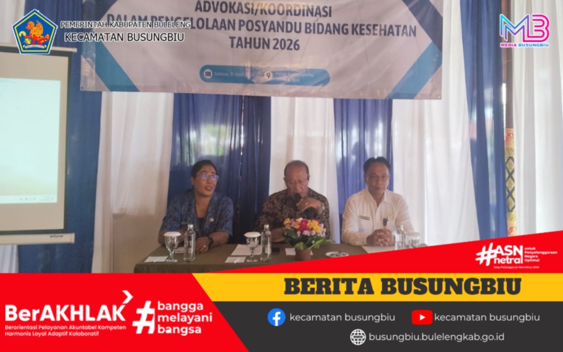 Selasa, 21 April 2026, bertempat di Hotel Aneka Lovina, Kasubag Umum dan Keuangan Kecamatan Busungbiu, Komang Windasari, S.E., menghadiri kegiatan Advokasi dan Koordinasi Pengelolaan Posyandu Bidang Kesehatan Kabupaten Buleleng Tahun 2026.