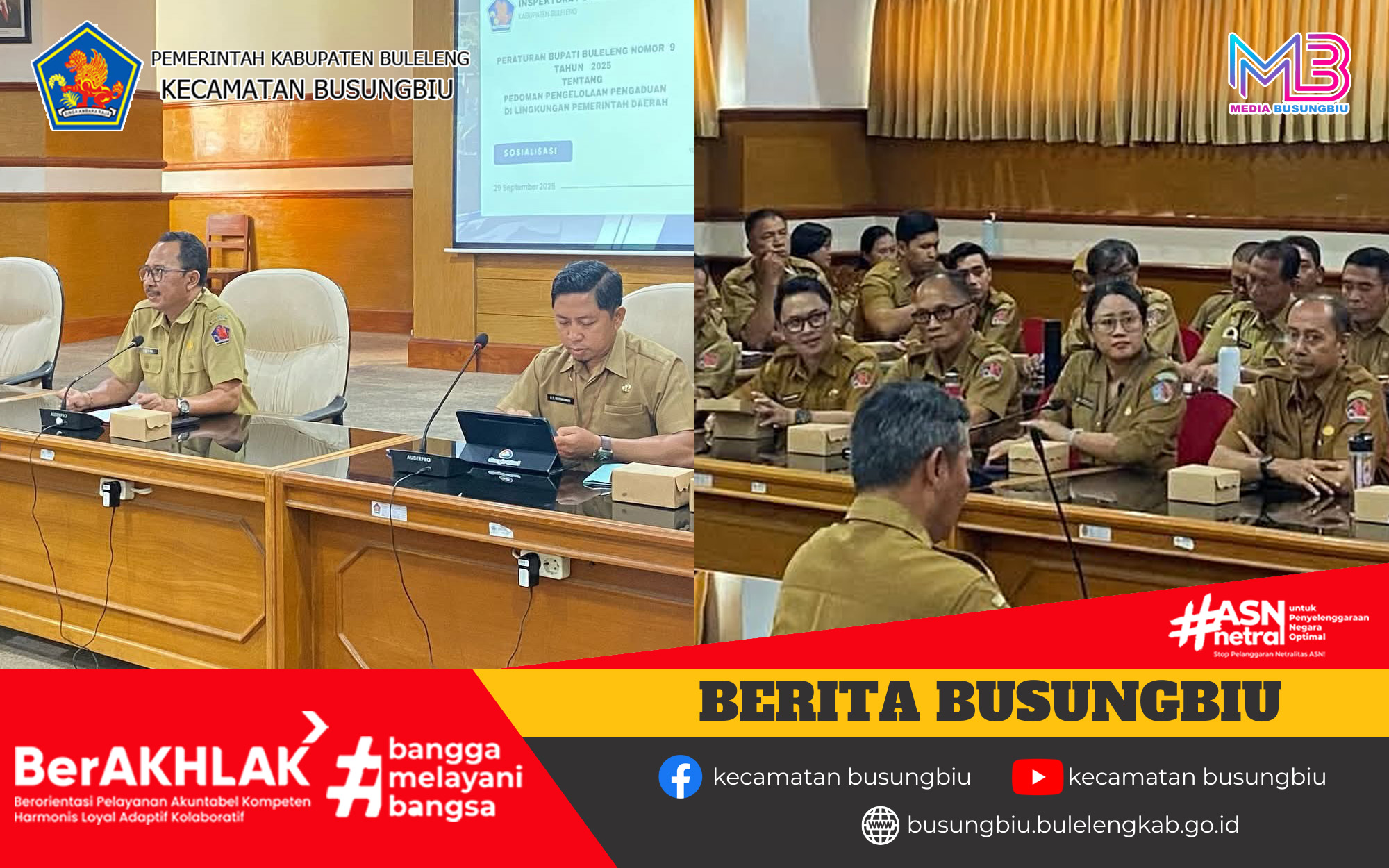 Senin, 29 September 2025, Camat Busungbiu, I Ketut Suastika, S.Sos hadir dalam Sosialisasi Peraturan Bupati Nomor 9 Tahun 2025 tentang Pedoman Pengelolaan Pengaduan di Lingkungan Pemerintah Daerah yang bertempat di Ruang Rapat Unit IV Kantor Bupati Buleleng. Kegiatan ini dipimpin oleh Sekretaris Daerah Kabupaten Buleleng, Gede Suyasa. Dalam arahannya, Beliau mengingatkan para pejabat dan ASN agar berhati-hati dalam bermedia sosial. Beliau juga menilai saat ini posisi pejabat sangat rentan disorot publik dan dengan mudah menjadi bahan viral.