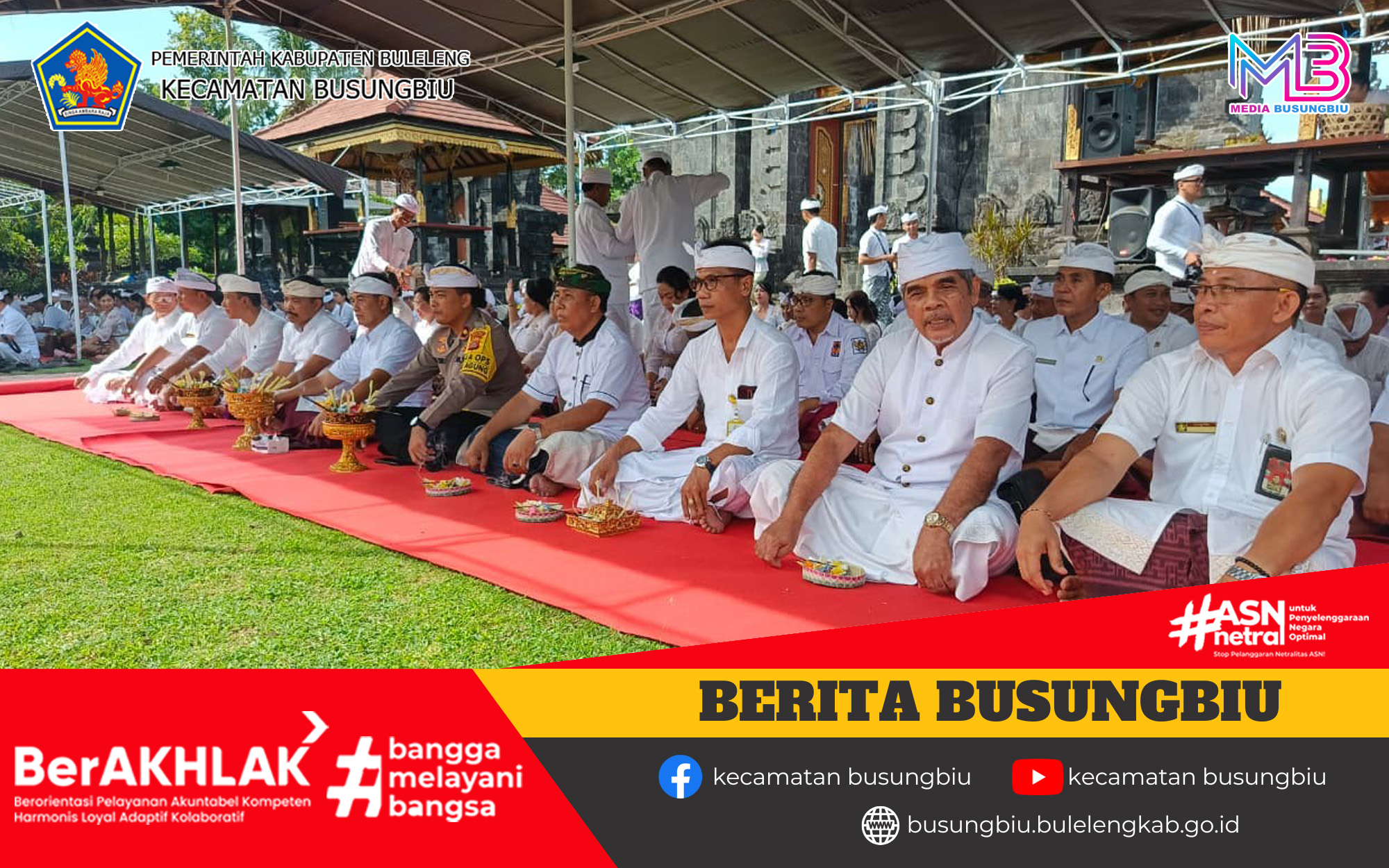 Kasi Sosial Budaya, I Putu Aryasa bersama dengan staf Kecamatan Busungbiu mengikuti Persembahyangan Bersama yang dilaksanakan di Pura Agung Jagatnata pada Hari Rabu, 24 Desember 2025. Kegiatan ini merupakan tindak lanjut atas surat Pemerintah Provinsi Bali terkait Pelaksanaan Haluan Pembangunan Bali Masa Depan 100 Tahun Bali Era Baru 2025–2125. Persembahyangan dihadiri oleh Wakil Bupati Buleleng, Ketua DPRD Kabupaten Buleleng, serta jajaran Organisasi Perangkat Daerah (OPD) di lingkungan Pemerintah Kabupaten Buleleng.