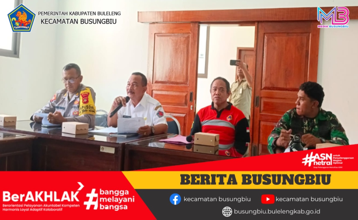 Sementara itu, perwakilan BMKG menyampaikan bahwa tiga kecamatan di Kabupaten Buleleng berpotensi mengalami cuaca ekstrem berupa hujan lebat, termasuk Kecamatan Busungbiu. Untuk itu camat diminta agar menginstruksikan para perbekel untuk melaksanakan kegiatan gotong royong pembersihan pohon dan selokan sebagai langkah antisipasi.