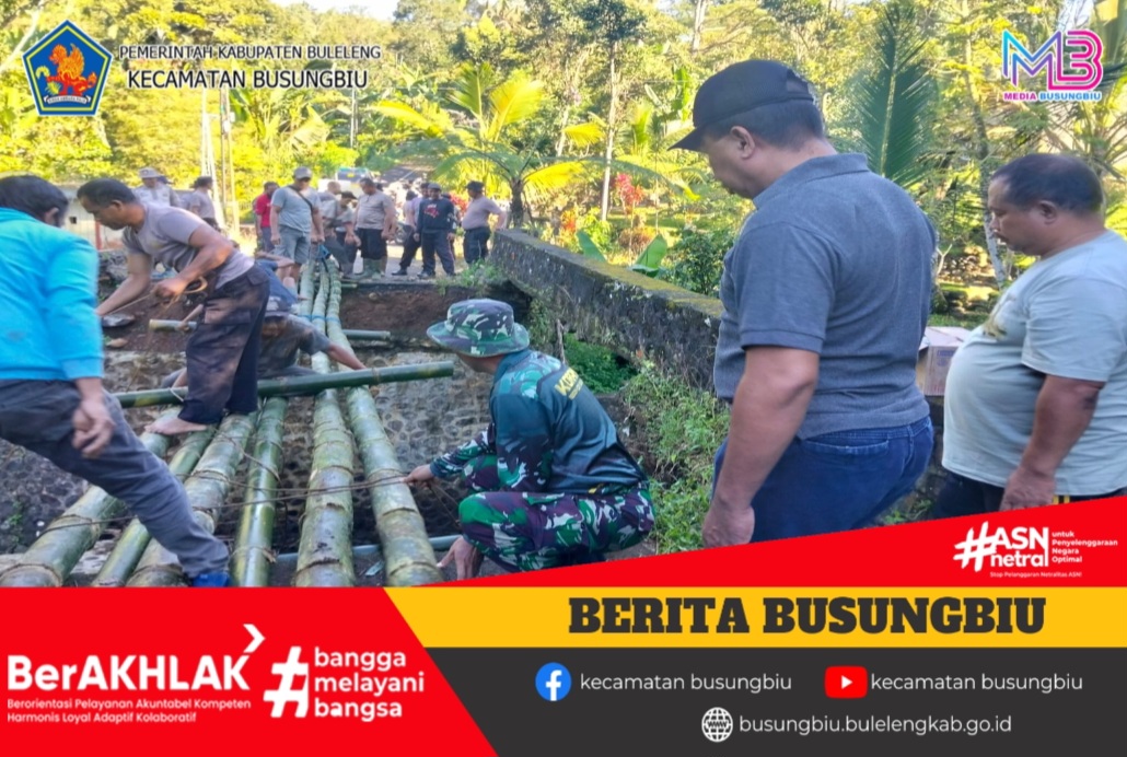Camat Busungbiu, Putu Gede Yudana, S.H., didampingi oleh Kasi Trantib dan Pol PP Kecamatan Busungbiu I Ketut Budiarsa,S.Sos, Kasi Pembangunan Kecamatan Busungbiu, I Gede Ariasa, S.Sos., mengikuti kegiatan gotong royong pembuatan jembatan darurat yang berlokasi di Tukad Yeh Leh, jalur penghubung antara Desa Bongancina menuju Desa Dadap Putih.