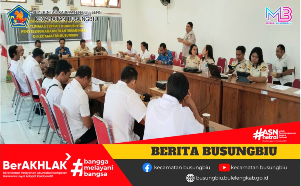 Kasi Trantib dan Pol PP Kecamatan Busungbiu, I Ketut Budiarsa, S.Sos, mendampingi kegiatan Rapat Sosialisasi Peningkatan Peran Satlinmas terkait Kondusifitas Penyelenggaraan Trantibum Linmas. Kegiatan ini diselenggarakan oleh Kepala Satuan (Kasat) Pol PP Kabupaten Buleleng di Aula Kantor Camat Busungbiu.
