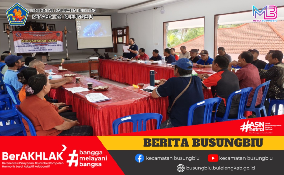 Jumat, 27 Maret 2026, Kasi Pembangunan Kecamatan Busungbiu, I Gede Ariasa, S.Sos., bersama staf Pembangunan Kecamatan Busungbiu, Komang Resa Saputra, S.Ap., menghadiri Musyawarah Desa dalam rangka penyampaian pertanggungjawaban pengelolaan BUMDes di Desa Kedis.